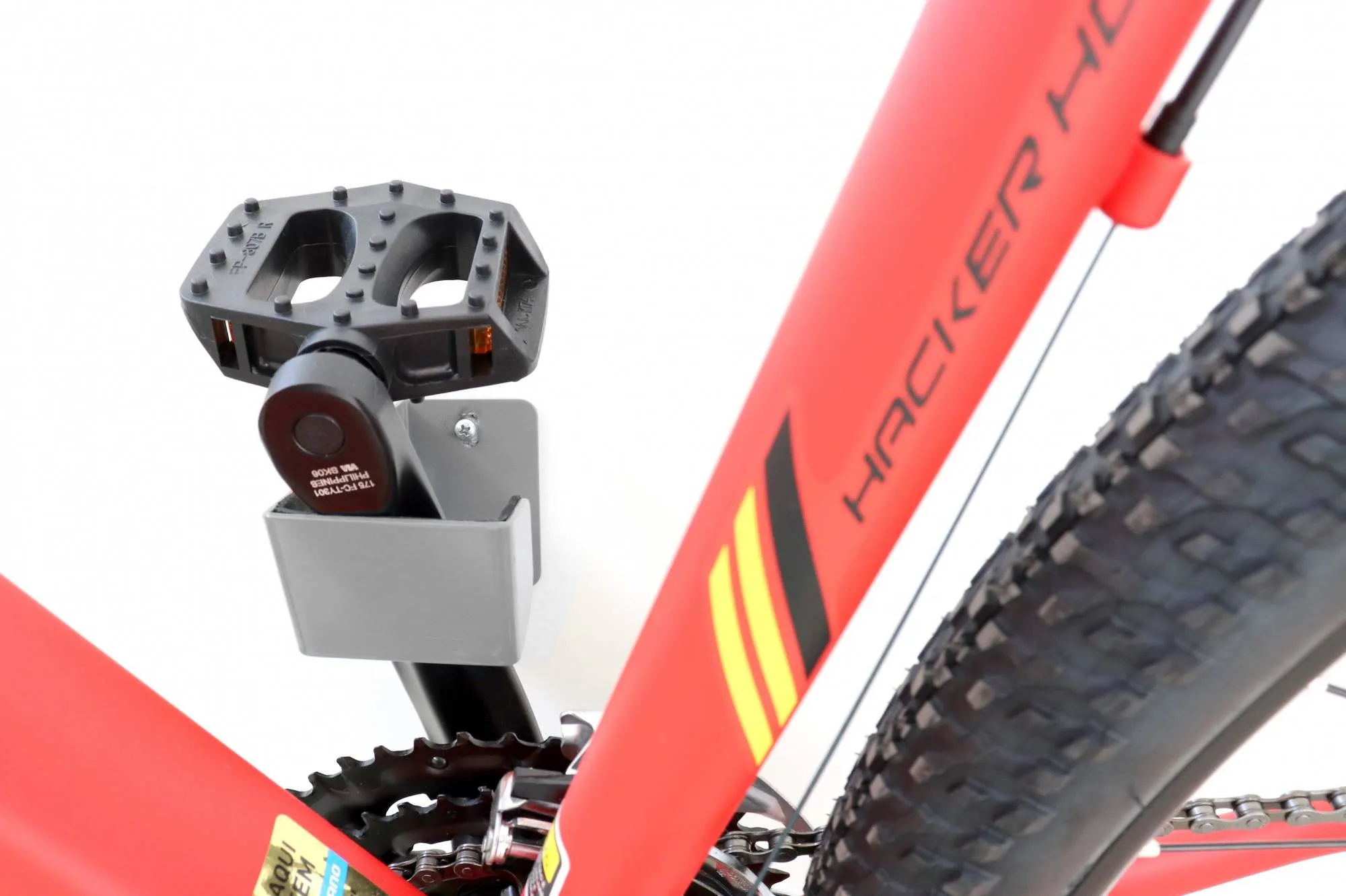 A bicicleta fica inclinada presa pelo pedivela;