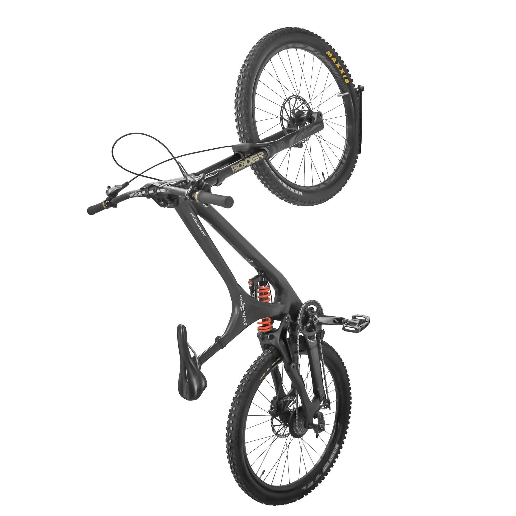 • A bike fica na vertical com a roda dianteira encaixada ao produto;